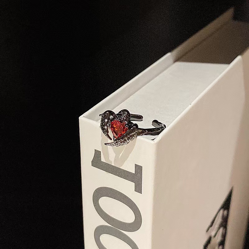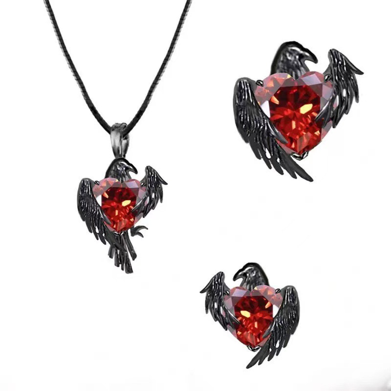 Color: necklace, stud earrings, red ring, purple ring, ring, left ear hanging, right ear hanging